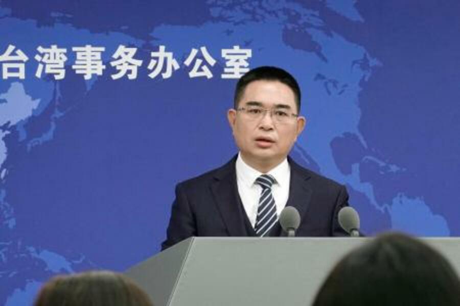 記者会見する中国国務院台湾事務弁公室の陳斌華報道官=12日、北京(共同)