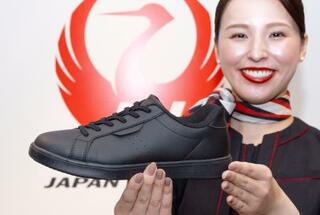 スニーカーを持つ客室乗務員=13日午前、東京都大田区