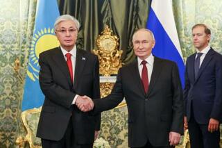 12日、モスクワで会談前に握手するロシアのプーチン大統領とカザフスタンのトカエフ大統領(左)(ロシア大統領府提供・タス=共同)