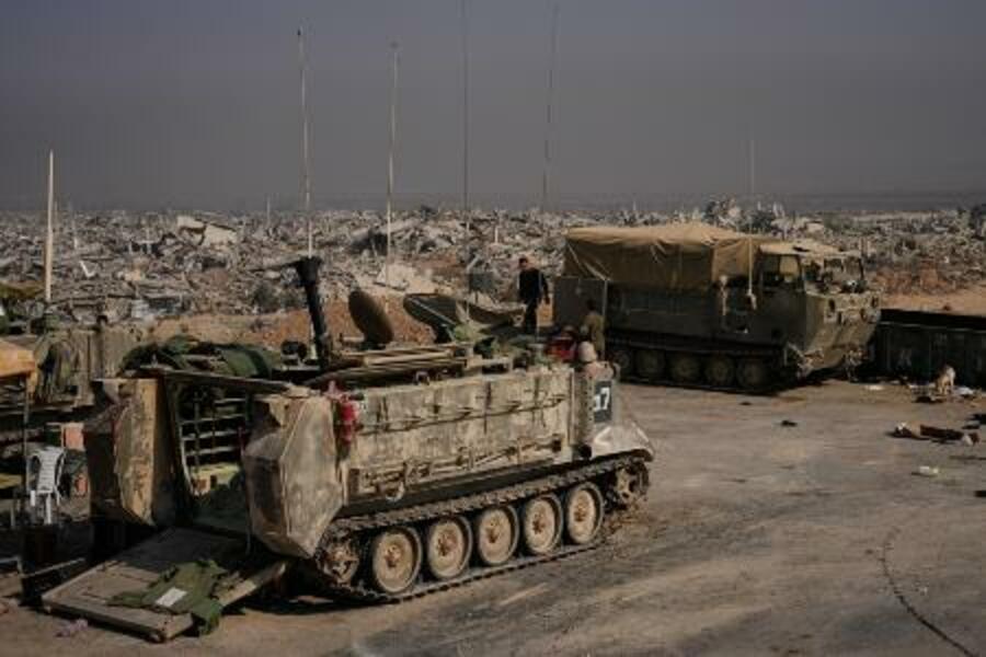ガザ北部ガザ市で、破壊された建物周辺に集まるイスラエル軍の車両=5日(AP=共同)