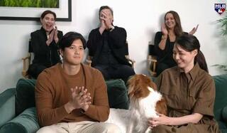 米大リーグ、ナショナル・リーグのMVPに満票で選ばれ、MLBネットワークの番組で喜ぶドジャースの大谷翔平。右は妻真美子さん=13日