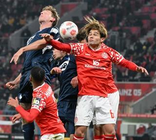 ホッフェンハイム戦で競り合うマインツの佐野海(右端)=マインツ(共同)