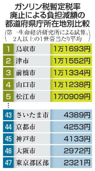 ガソリン税暫定税率廃止による負担減額の都道府県庁所在地別比較
