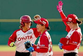 3回、先制2点打を放ち笑顔のトヨタ・石川(左)=ジャイアンツタウンスタジアム