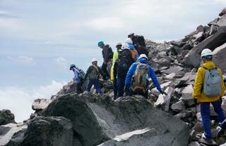 溶岩ドーム「平成新山」を視察する参加者=17日午後、長崎県の雲仙・普賢岳