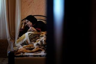 自宅で横たわるアファフ・アブアリアさん=10月27日、ヨルダン川西岸ムガイヤ(共同)