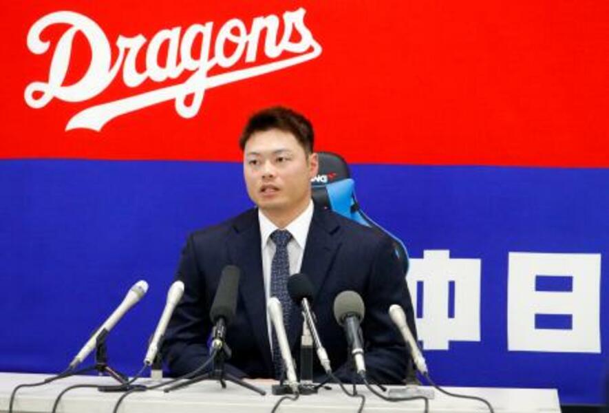 契約を更改し、記者会見する中日・細川=17日、ナゴヤ球場