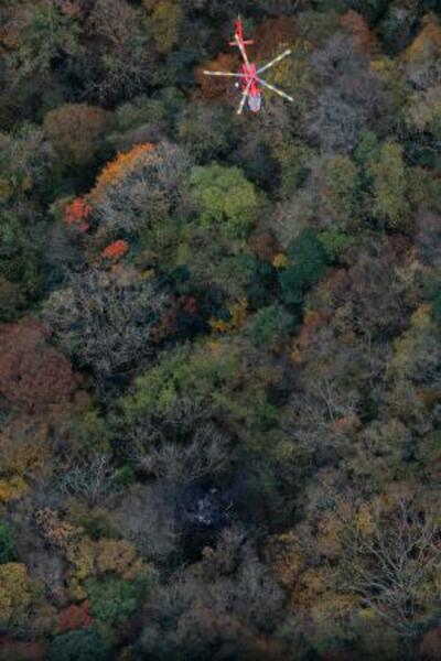 小型機が墜落したとみられる現場(下)で救助活動を行う消防ヘリ=18日午後1時5分、福岡県八女市(共同通信社ヘリから)