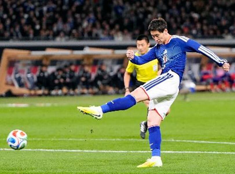 日本―ボリビア 前半、先制ゴールを決める鎌田=国立競技場