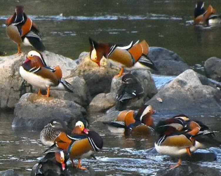 鳥取県日野町の日野川に飛来したオシドリの群れ=15日