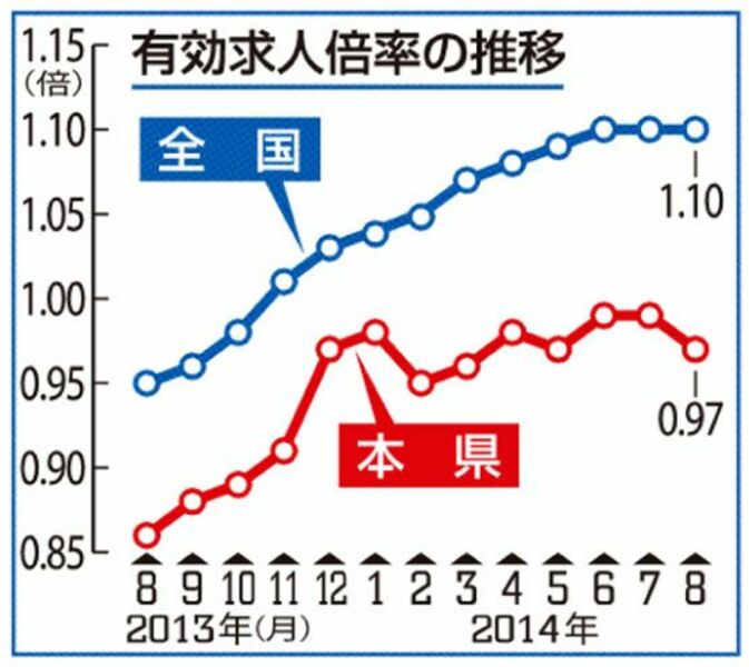 8月の県内/有効求人倍率0・97倍/求職増え3カ月ぶり低下