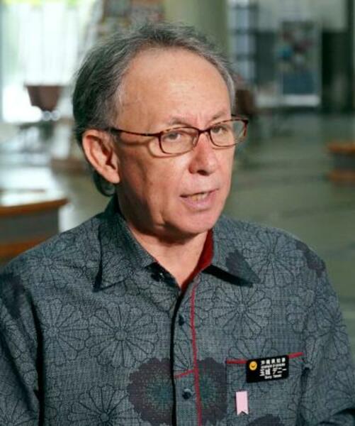 報道陣の取材に応じる沖縄県の玉城デニー知事=19日午後、沖縄県庁