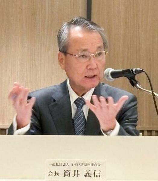 福井市で記者会見する経団連の筒井義信会長=19日午後