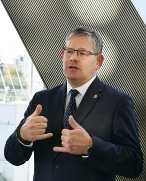 手話で取材に応じる国際ろう者スポーツ委員会のコーサ会長=19日、東京都江東区