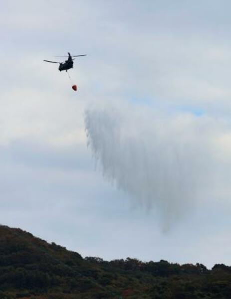 大分市佐賀関の大規模火災現場付近で上空から散水する自衛隊のヘリコプター=20日午前10時26分