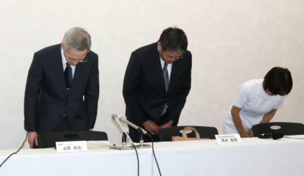 記者会見で謝罪する岐阜県総合医療センターの桑原尚志院長(左)ら=20日午後、岐阜市