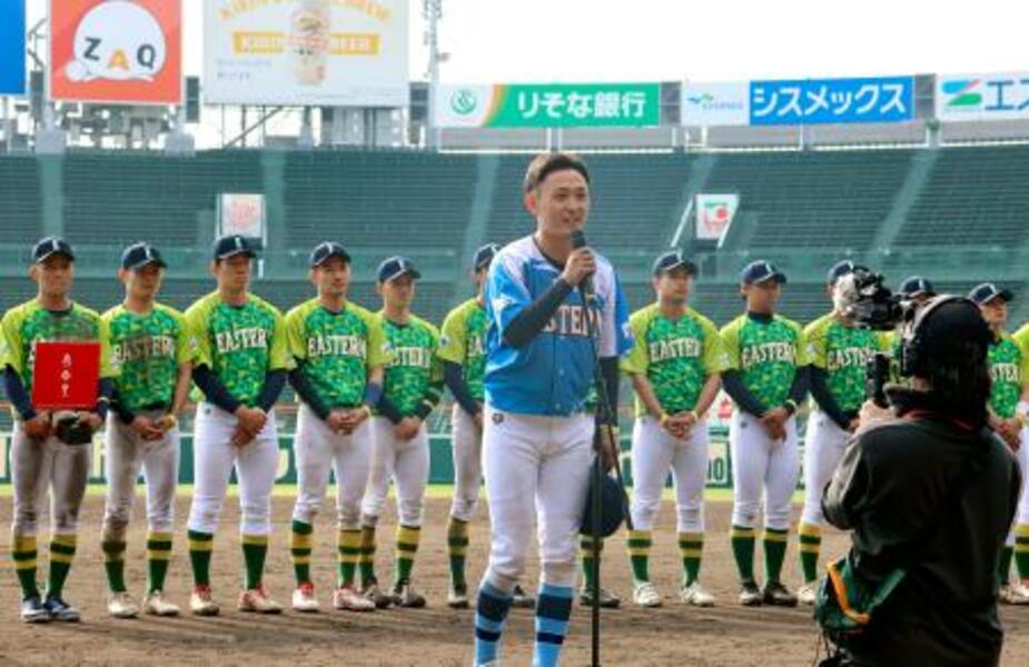 準硬式野球の全日本大学日本一決定戦で、試合後にあいさつする西日本選抜の前原隼人主将=甲子園