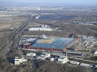 次世代半導体の国産化を目指すラピダスの工場(手前)。左奥は北海道千歳市の市街地