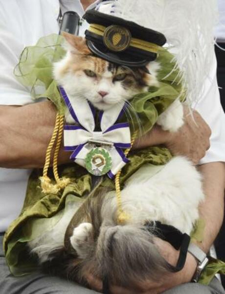 和歌山電鉄貴志駅の三毛猫の駅長「ニタマ」=2021年、和歌山県紀の川市