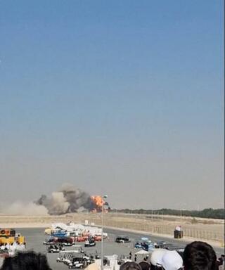 21日、アラブ首長国連邦のドバイで墜落し、炎上するインドの国産軽戦闘機(JIGNESH VARIYA提供、ロイター=共同)