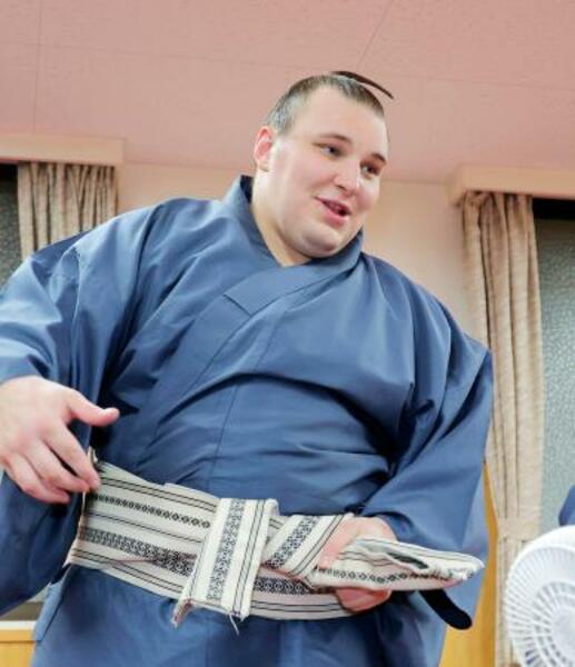 支度部屋で笑顔を見せる安青錦=福岡国際センター(代表撮影)