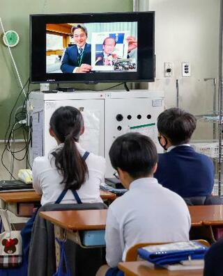 校内放送でノーベル賞について学ぶ児童たち=11日午前、大阪府寝屋川市