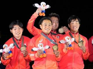 男子400メートルリレーで金メダルを獲得し、笑顔を見せる(左から)岡本隼、佐々木琢磨、冨永幸佑、坂田翔悟=駒沢陸上競技場