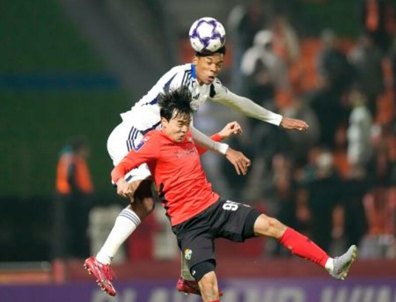 町田―江原 後半、ヘディングで競り合う町田・望月(上)=春川(共同)