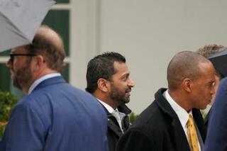 ホワイトハウスで恒例「七面鳥恩赦式」に出席したFBIのパテル長官(中央)=25日、ワシントン(ロイター=共同)