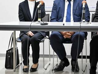 初公判後、取材に応じる松本凰汰さんの両親=26日午後、高知市
