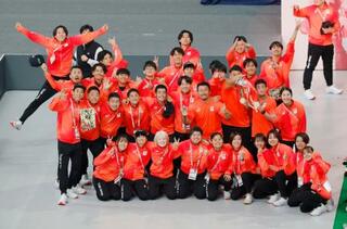 「東京デフリンピック」の閉会式を前に、記念撮影する日本選手団=26日、東京体育館