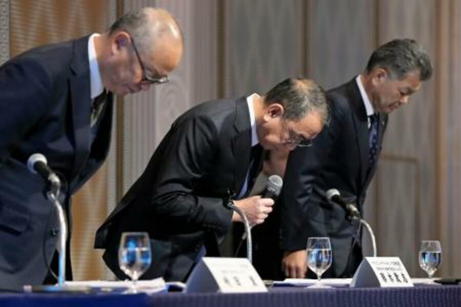 サイバー攻撃によるシステム障害について謝罪するアサヒグループホールディングスの勝木敦志社長(中央)ら=27日午前、東京都千代田区