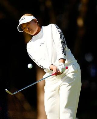第3日、1番でアプローチショットを放つ鈴木愛。通算6アンダーで首位=宮崎CC
