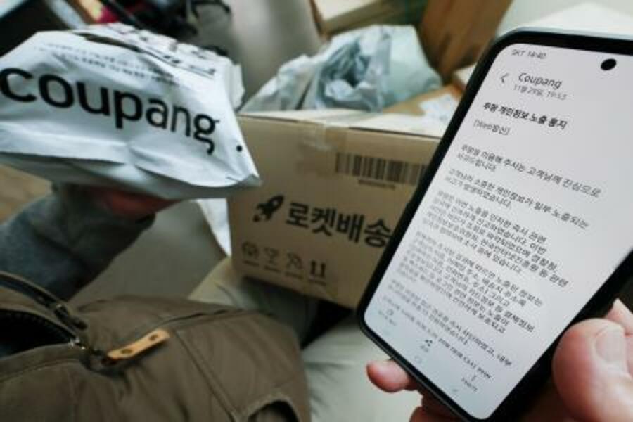 30日、クーパン顧客の携帯電話へ送られた、情報流出の事実を通知するショートメッセージ(右)と同社からの配達品(聯合=共同)