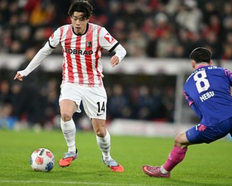 マインツ戦で競り合うフライブルクの鈴木唯=フライブルク(共同)