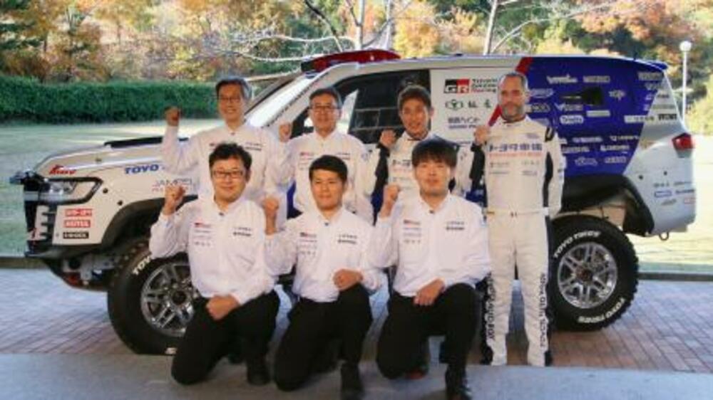 「ダカール・ラリー」参戦を発表し、ポーズをとる三浦昂氏(後列右から2人目)らトヨタ車体チーム=1日午前、愛知県豊田市
