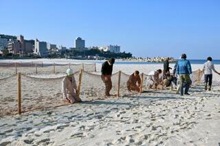 和歌山県白浜町の白良浜で、砂の飛散を防ぐネットを設置する町職員ら=11月