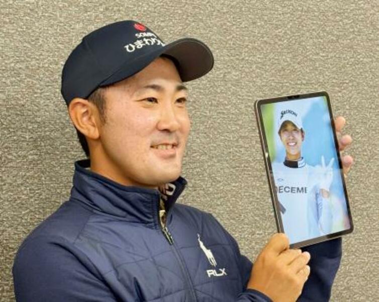 結婚相手の吉本ここねの画像とともに笑顔を見せる金谷拓実=3日、東京よみうりCC