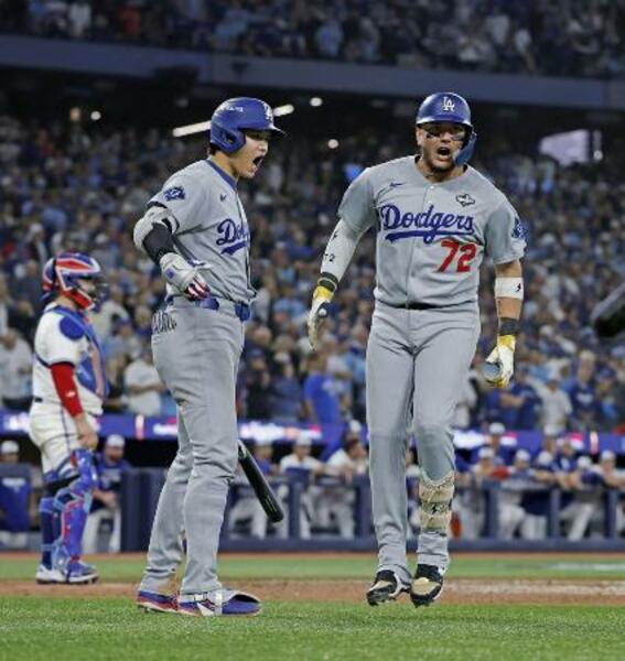 ブルージェイズ戦の9回、同点ソロを放ったロハス(右)を迎えるドジャース・大谷=2025年11月、トロント(共同)