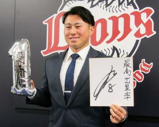 契約交渉を終え、ポーズをとる西武・渡部聖=4日、埼玉県所沢市