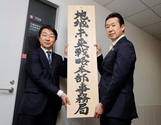 「地域未来戦略本部事務局」の看板をかける黄川田地方創生相(右)ら=4日午後、東京・永田町
