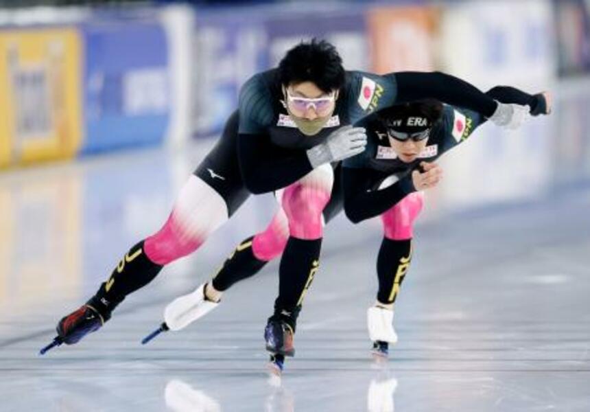 スピードスケートW杯第3戦を前に調整する新濱立也(手前)と広瀬勇太=ヘーレンフェイン(共同)