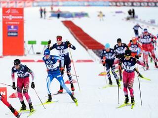 W杯複合男子個人第3戦の前半距離で27位の山本涼太(左端)と34位の木村幸大(右手前)=トロンヘイム(共同)