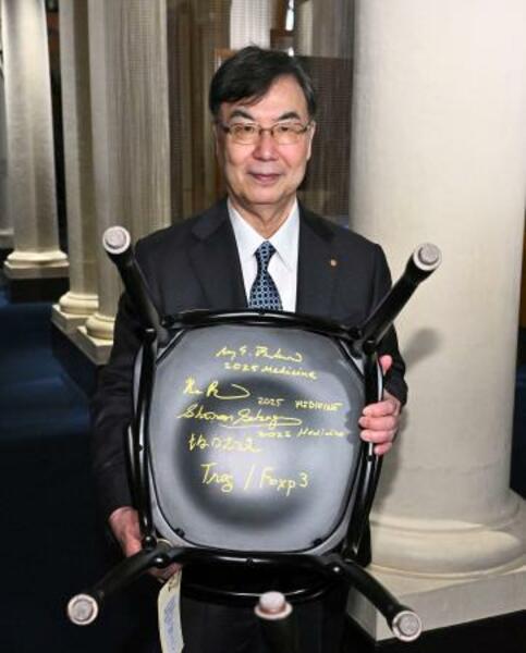 ストックホルムのノーベル博物館を訪問し、椅子の裏に書いたサインを披露する坂口志文・大阪大特任教授=6日(ロイター=共同)