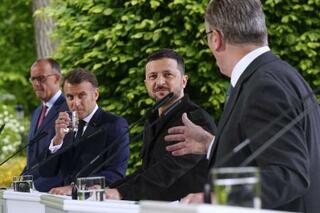 5月、ウクライナの首都キーウで首脳会合を開き、共同記者会見する(左から)ドイツのメルツ首相、フランスのマクロン大統領、ゼレンスキー大統領、英国のスターマー首相