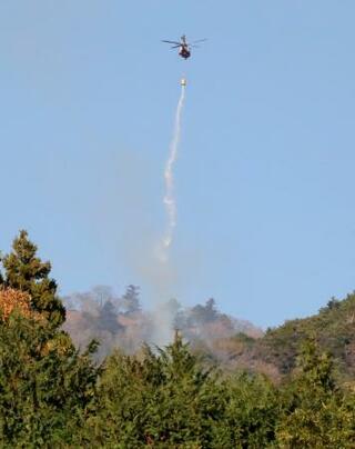 神奈川県伊勢原市と厚木市にまたがる日向山で散水する消防ヘリコプター=10日午前8時12分