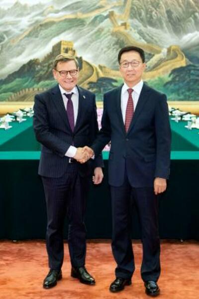 ドイツのワーデフール外相(左)と握手する中国の韓正国家副主席=8日、北京(新華社=共同)