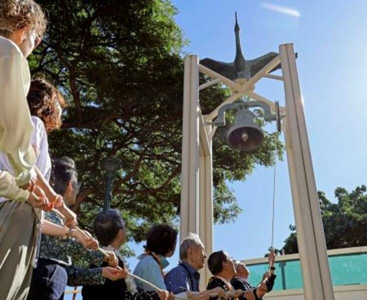 ホノルルにある「長崎の鐘」を鳴らす長崎の被爆者団体代表団ら=8日、米ハワイ(共同)