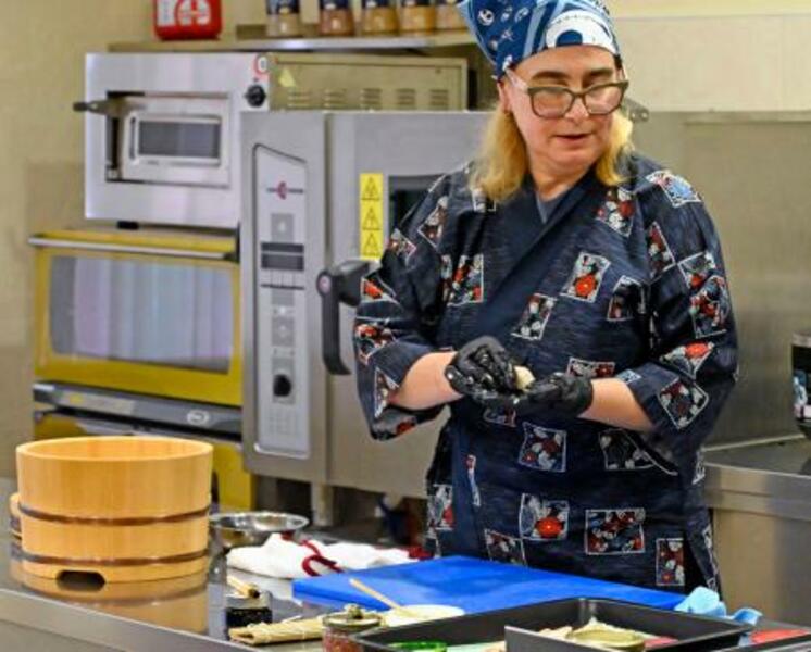 8日、キーウにある国立貿易経済大で、すしの握り方を実演するラリサ・バルスカさん(共同)