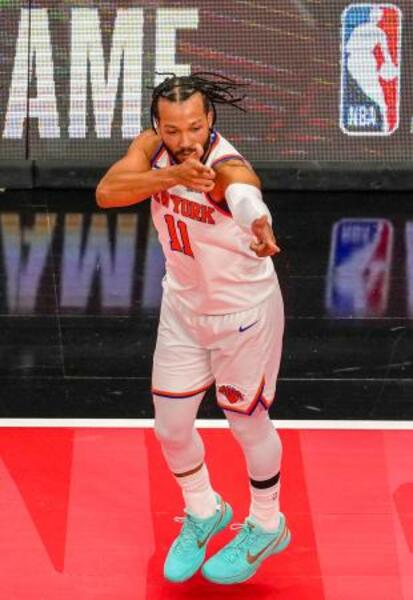 ラプターズ戦で得点し、ポーズを決めるニックスのブランソン=トロント(イマジンイメージズ・ロイター=共同)